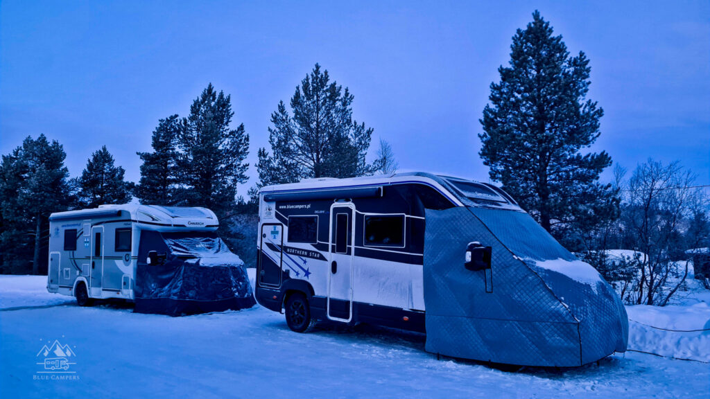 Zimą tylko nieliczna część kempingów jest czynna. Kluczem jest zaplanowanie postojów z wyprzedzeniem, a w niektórych miejscach jak Rovaniemi jest konieczna wcześniejsza rezerwacja. W naszym przypadku, przy odpowiednio wyposażonych kamperach gwarantujących niezależność energetyczną mieliśmy możliwość również postojów na dziko, nad brzegiem zamarzniętego jeziora. Należy jednak być ostrożnym przy wyborze miejsca na postój aby nie zostać uwięzionym w grubej warstwie śniegu.