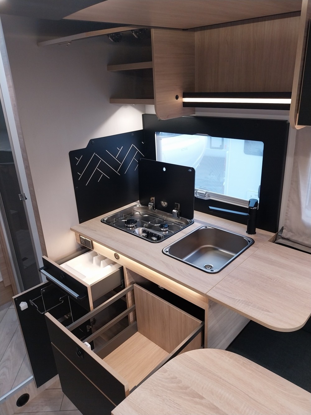 – Duża lodówka 141 L z zamrażalnikiem Thetford z systemem AES (automatycznie wybiera źródło zasilania)