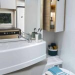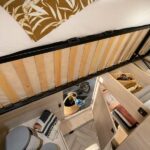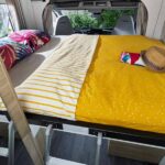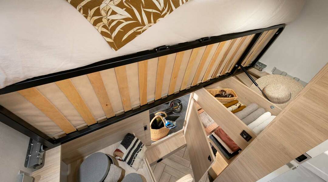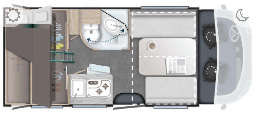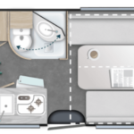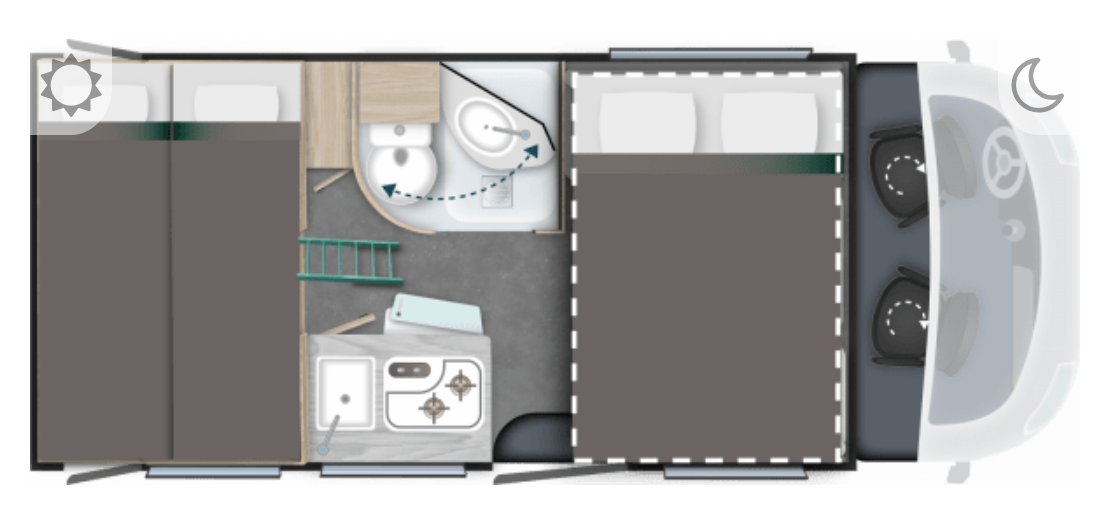 – Elektrycznie opuszczane łóżko 2-osobowe podwieszane w zabudowie 140 x 190 cm (w czasie złożenia „przylega” do sufitu i pozwala na użytkowanie całej przestrzeni kampera)